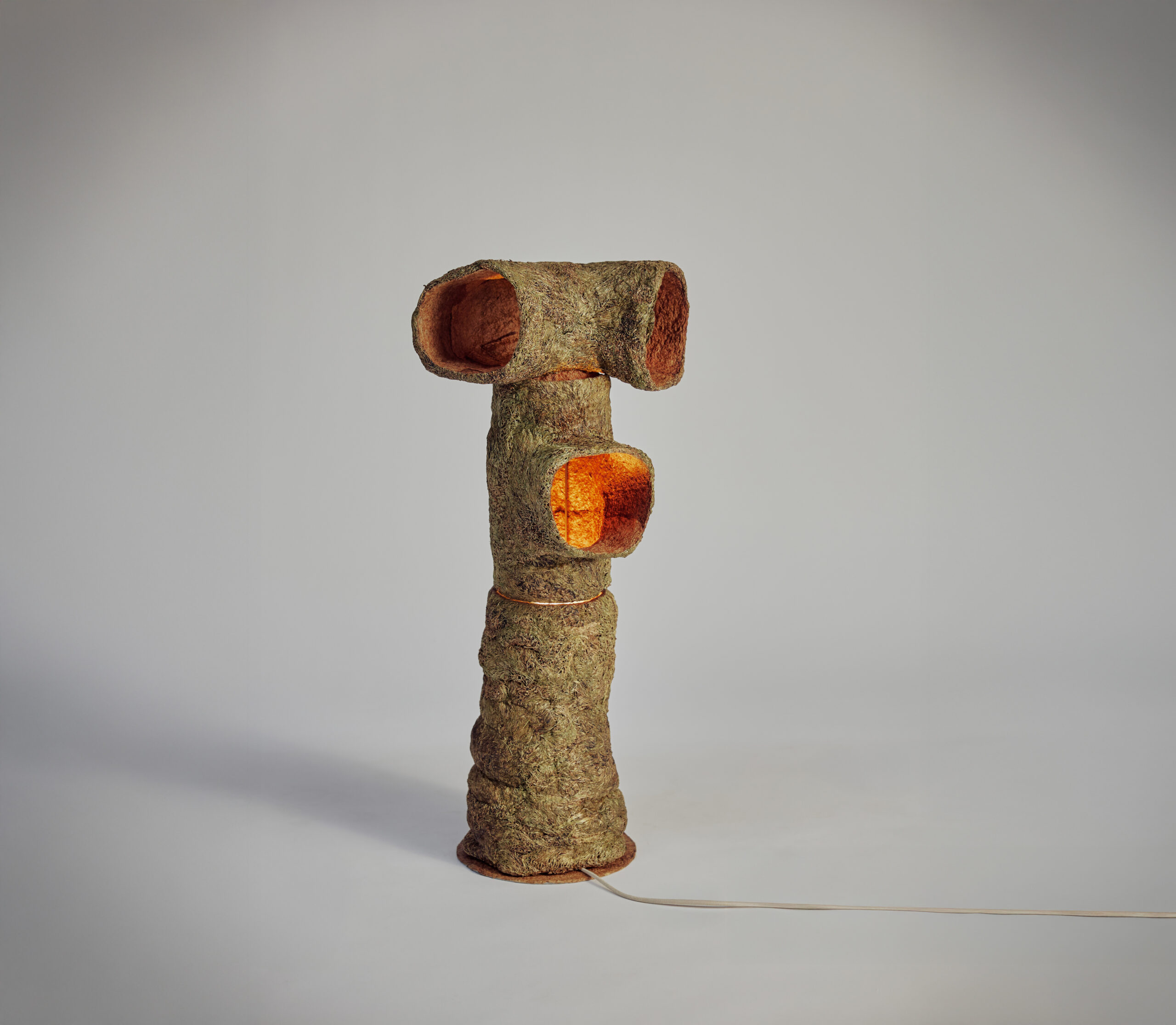 Root Lights are one-off sculptural luminaires crafted from root-grown material, cultivated and harvested in the MWO atelier from locally germinated seeds. The length of the growth period influences the level of transparency, creating subtle variations in light diffusion and surface texture.