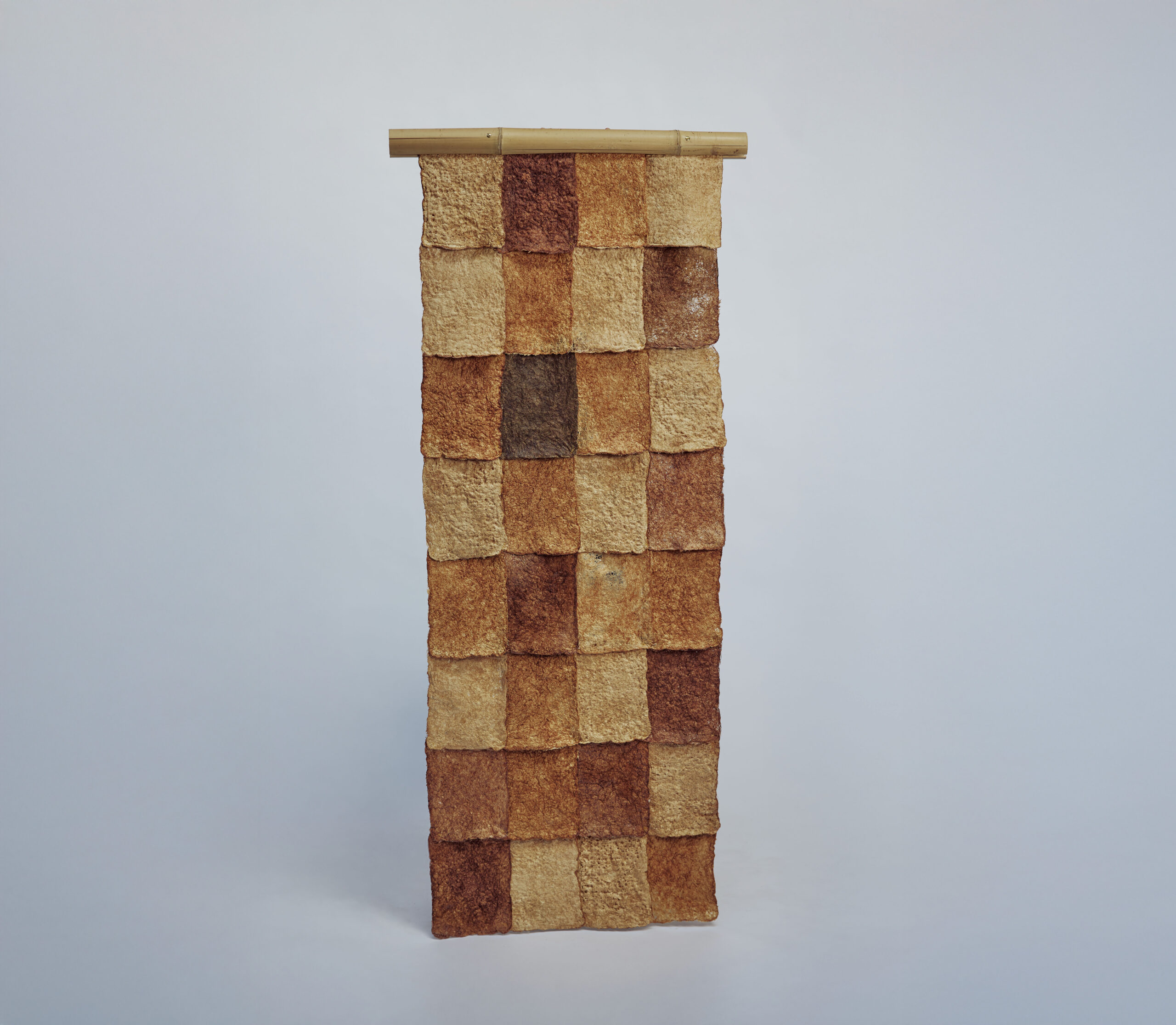 Root Fabric is a wall tapestry cultivated from plant root systems. The material, grown from roots, is stabilized to become a flexible surface designed for interior walls. It is finished with an atelier-made, algae-based varnish. Its texture resembles leather, with natural variations in grain and tone. The piece shown here is unique. Root Fabric can also be developed as a veneer or wall cladding, adaptable to different surfaces in collaboration with architects and designers.